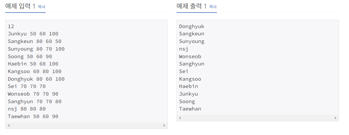- 모든 점수가 같으면 이름이 사전 순으로 증가하는 순서로 (단, 아스키 코드에서 대문자는 소문자보다 작으므로 사전순으로 앞에 온다.)