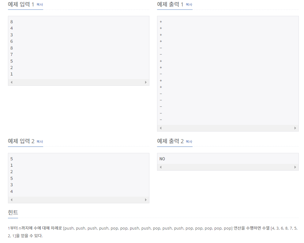 예제입력1을 기준으로 설명하면 8개의 숫자가 입력되는데 맨처음 4라고 입력읻 주어졌으니 1,2,3,4 를 입력한 후 출력해야 4를 pop으로 뺄수있으므로 ++++ 후 - 로 빼준다. 다음 적힌 3은 남아있는 수 123 중에서 바로 pop할수 있으니 -를 적어준다. 12까지 남아있는 상태에서 다음 적힌 6을 추가하려면 처리된 34를 제외하고 5,6,을 넣어준후 빼줘야하므로 ++ - 이런순으로 코드를 작성하면 되는 문제이다.